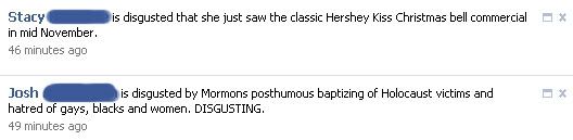 Just another example of how Facebook is changing the way we communicate. No issue is too large or too small to be disgusted about...